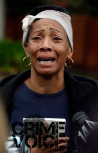 Cynthia Mose of Sacramento holds a book written by Shareef Allman as she speaks to members of the media in Sunnyvale, Calif., where Allman was found and shot dead by law enforcement officers. Allman was friends with her son.