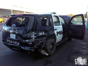 Police say the unknown suspect, while traveling northbound on the freeway at excessive speeds, ran into the back end of the police vehicle.