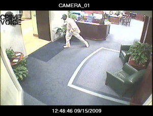 The suspect strode into the bank just after 1 p.m. Tuesday, leaping into the teller area and demanding money from an employee. Upon his escape, the suspect exited through the rear door, which leads into an interior lobby shared by other businesses in the building.