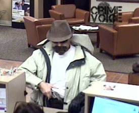 As part of his disguise, the suspect wears a fedora-type hat and a fake goatee leading authorities to nickname him the “Fake-Bearded Fedora” bandit. In each of the robberies he displayed a handgun and typically uses a black, eco-friendly-type bag commonly found at many supermarkets for his loot. The bag has straps and unidentified green writing on it.