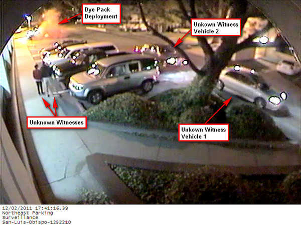 The clip depicts two witnesses who stopped and watched the suspect as the dye pack deployed. The video also shows two vehicles passing the suspect while the dye pack deployed.