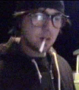The suspect is described as a white male adult, early 20s 160-180 lbs., black hair, unshaven beard, black hoodie, black t-shirt, black baseball hat. He was wearing large black frame glasses that appear to be smoked.