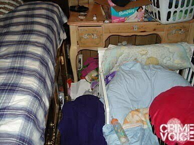 The child’s crib placed next to the bed. Coin purse, cigarettes and lighter next to the Pampers on the dresser.