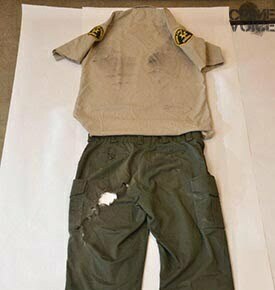 The Deputy, who has been with the Santa Cruz County Sheriff Office for only one year, was transported to Dominican Hospital for treatment of his injuries and released. His uniform showed some of the effects of the encounter as well.