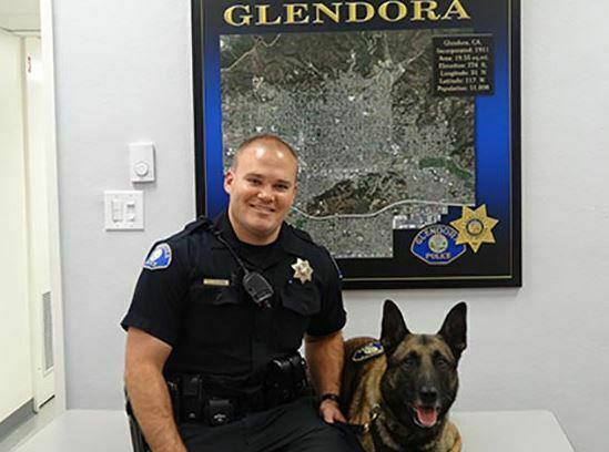 Police Canine Bo scored his very first suspect in the hills of Glendora last night. After being pepper-sprayed, then thrown down a steep ravine while grabbing the arm of one of the eight members of a robbery ring, Bo jumped back up to aid the mutual agents called in from the surrounding cities. Bo’s assistance helped the four-hour operation in the Glendora Hills’ containment area cover the robbery ring’s three cars, capture the eight members, five young women and three men, and escort them to the Glendora jail.