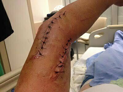 One of the victims, who suffered severe cuts on his arm, posted pictures of his stitched up wounds from the hospital (left) and posted this account of the incident on Facebook: “On my way home last night from Tank House me and my friends were jumped and stabbed by two guys who called us “faggots for wearing tight jeans”. We did nothing to provoke them. We were in the wrong place at the wrong time. My arm was completely mangled by a 7-8 inch Rambo knife. I got out of surgery a few hours ago and I’m still in shock this happened to us. After I was stabbed I saw how bad it was and started running to Press Club so I could get help. I’m not sure who you are but thank you to the girl who identified the guys who did this to us. They are in jail thanks to you and hopefully get charged with attempted Murder. [To his friend] thanks for saving my life man I’m glad you were there to stop them from stabbing me in the back when I was running away.This [deleted] has to stop in our city. We literally had the best day ever and everything changed in 5 minutes of hate. My arm will never be the same its devastating to me. My wife has been by my side the entire time and I needed it so bad. Spread love stop the hate.”