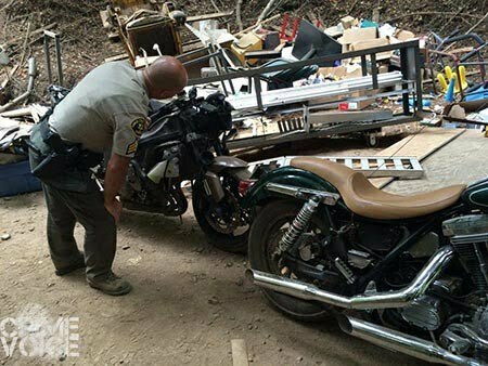 According to Kelly Kent of the Santa Cruz Sheriff’s Department, an anonymous tip led them, along with agents from the Santa Cruz Auto Theft Task Force, up the 8 mile drive from Boulder Creek along Bear Creek Road to Cabibi’s property. There they found a working chop shop, with 13 stolen motorcycles, trucks, and cars, all taken from Santa Cruz, Alameda and Santa Clara Counties. They also found a trailer that had been stolen from a church in Mountain View. Many of the vehicles were in the process of being dismantled and having their VIN numbers removed.