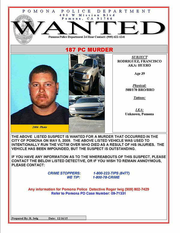 The Pomona Police are asking for the public’s help in solving a still-open seven-year-old case – by alerting them to the whereabouts of Francisco Javier Rodriguez, 39, who is suspected of intentionally running over and killing Jose DeJesus Chavez on the night of May 5, 2009.