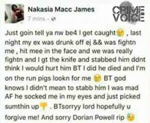 James had issued a social media report that Powell had been beating her, “[he] hit me in the face and we was really fighting and I got the knife and stabbed him … didn’t think I’d hurt him … but he died.”