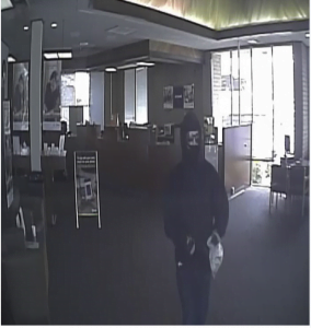 At around 1:05 PM, a young man — described as being in his late 20s, standing between 5’8″ and 5’10”, dressed in all black with a hood around his head, black sunglasses, and dirty white shoes — entered the bank, jumped over the counter, and brandished a handgun at employees. He demanded they put cash in a black clothing bag and soon fled with an undisclosed amount of money.
