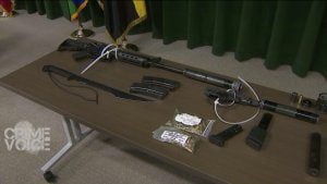 During his detainment, officers searched his duffel bag and discovered a rifle, handgun, silencers, and several gun magazines.