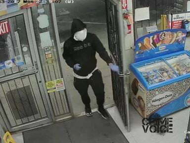 Surveillance video footage shows two males enter the store around 10:50 PM. One suspect was dressed in a black jacket, gray pants, white socks but no shoes. A blue bandana covered his face and he carried a silver revolver in his gloved hand.