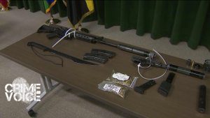 During the process of detainment, authorities searched Goodine’s duffel bag and discovered a rifle, handgun, silencers, and gun magazines.