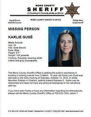 CHALFANT – Several weeks have now passed since 16-year-old Karlie Lain Guse walked away from home.