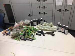 The duffel bag that was reported earlier was later found in the nearby carport. Inside were “two firearms and a large quantity of codeine syrup,” all determined to be the property of Trent and Robledo.