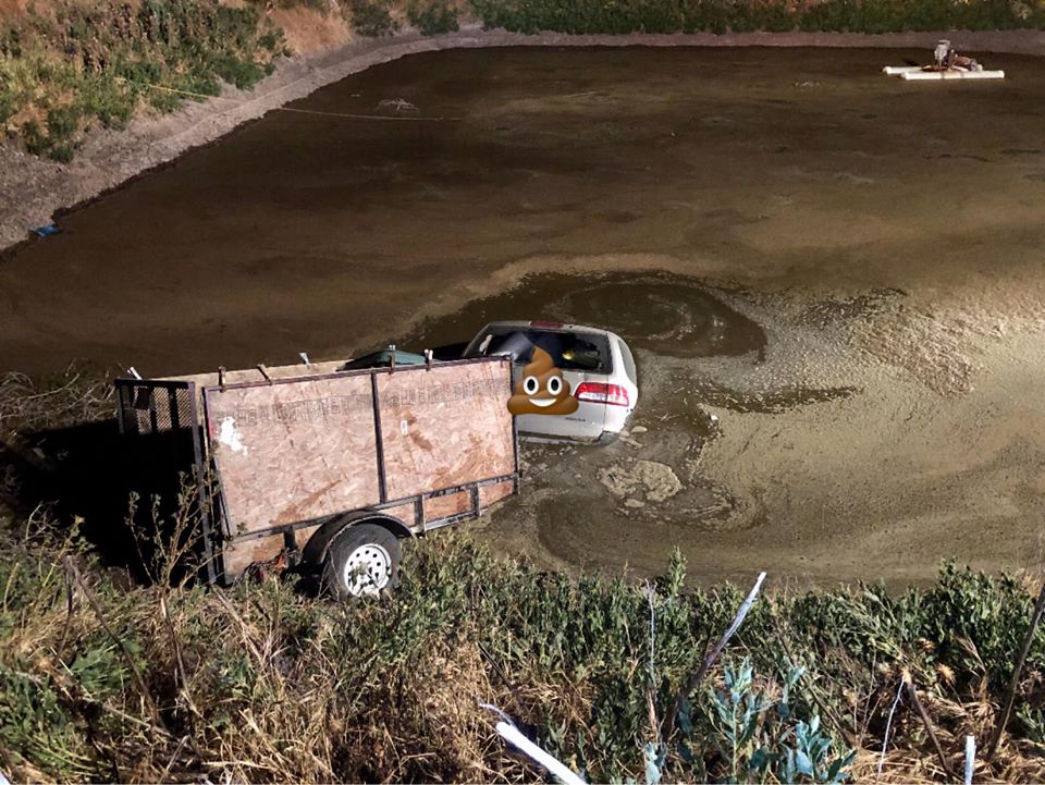 South Sacramento CHP Area units arrived on scene and it was determined that the driver was in the manure pond for approximately one hour trying to get out of his vehicle before giving up and calling 9-1–1 for help.