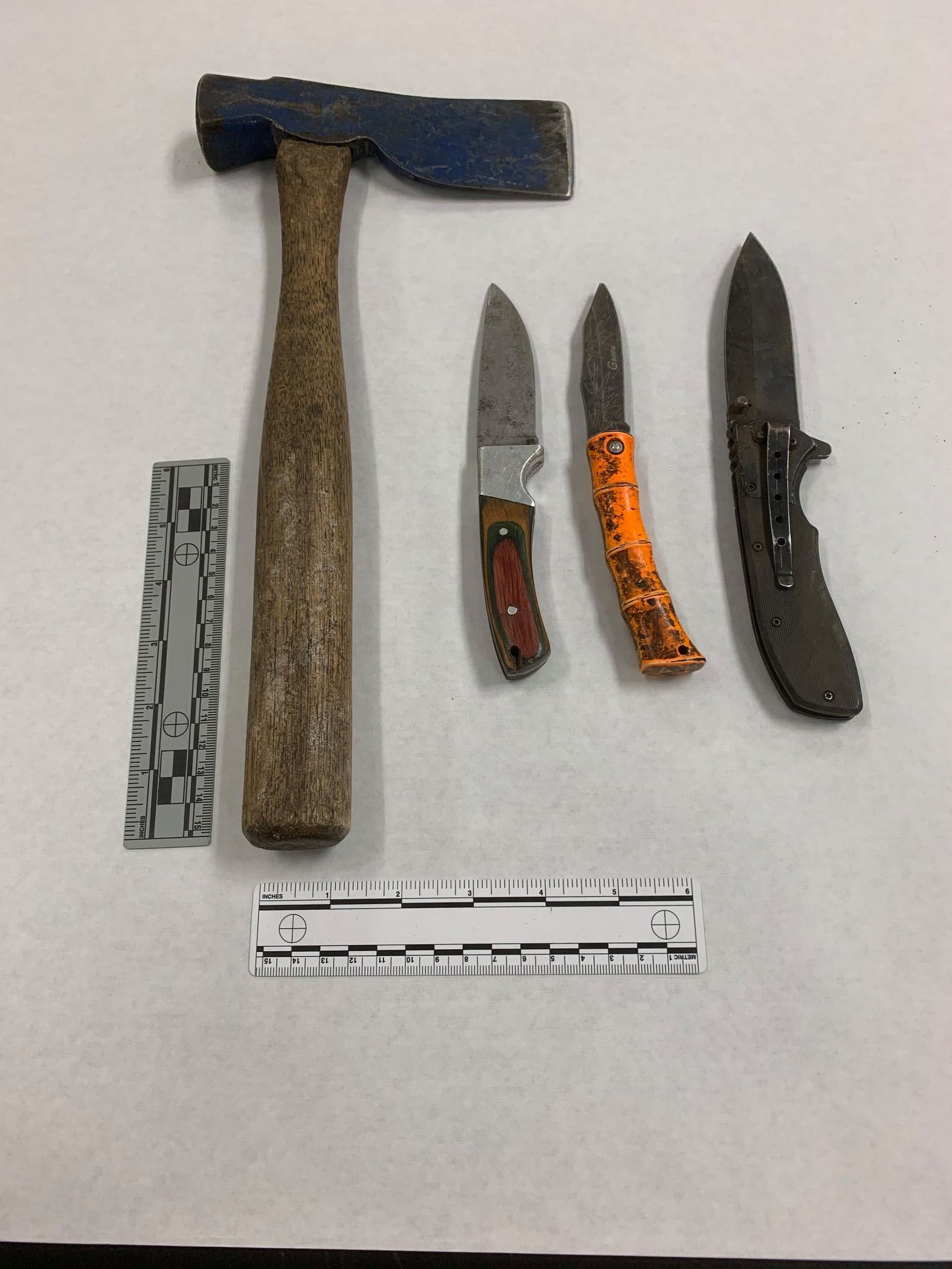 After officers located and separated the two, police say the man — identified as 59-year-old John Sandoval — stood on the bank holding a hatchet and three knives, refusing to comply with orders to surrender.