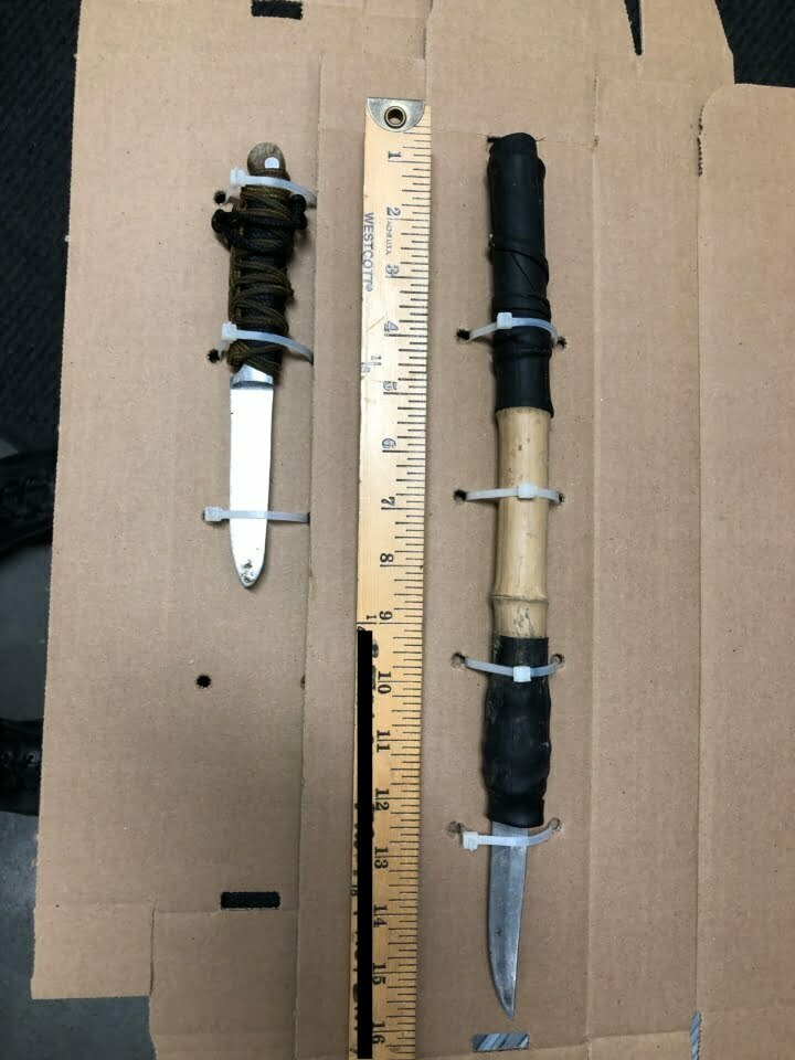 Officers located the suspect on University Avenue, walking away from the marina. Officers attempted to detain him, but he brandished knives at them and ran away.