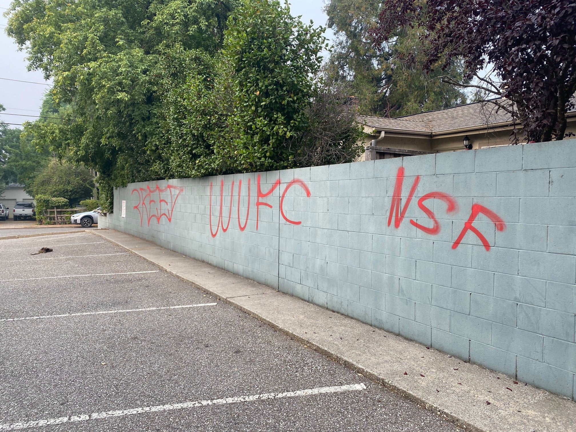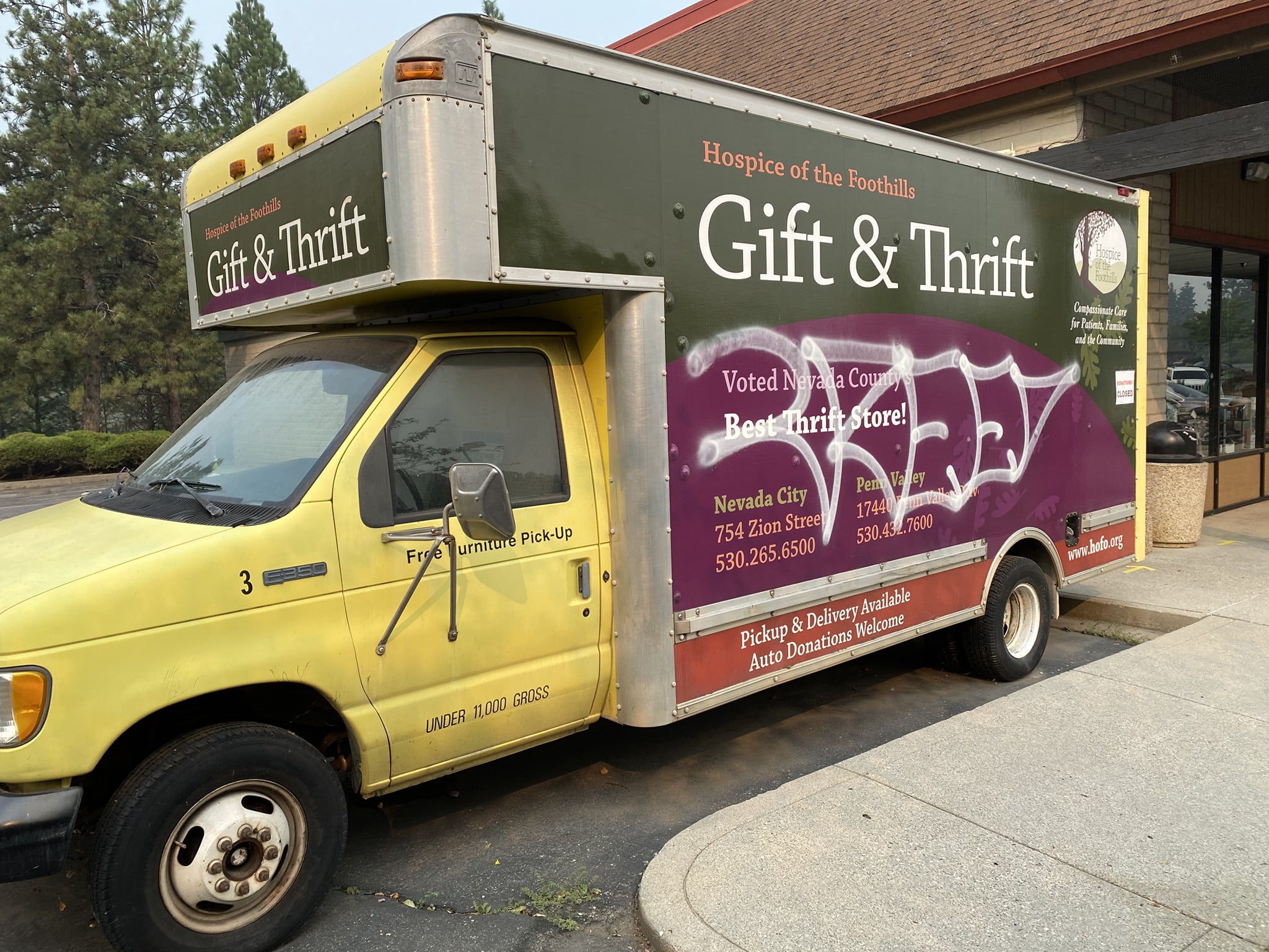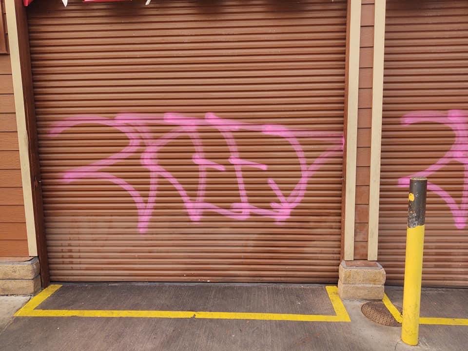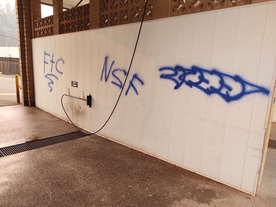 “Between August 23 – 25, a lone suspect vandalized 28 businesses and one private residence that were located on South Auburn Street, McKnight Way, and Freeman Lane in Grass Valley.These 29 locations were “tagged” with graffiti that included “CREED”, “NSF”, “FTC”. Most of the graffiti was about 6 feet wide. It is estimated that the cost of clean-up and/or replacement of damaged property will be thousands of dollars.