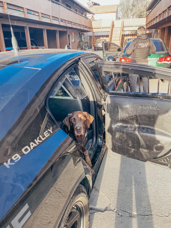 K9 Oakley was called in to conduct a sniff of the vehicle and alerted to underneath the drivers seat. Officers located a loaded 9mm Springfield XD firearm with a scratched off serial number.