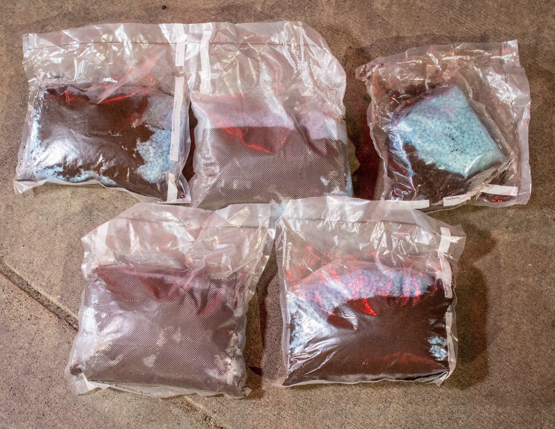A subsequent search revealed a hidden compartment built into the rear seats. Once the compartment was accessed, five large packages of suspected counterfeit Oxycodone pills were recovered. The pills had a weight of 11 pounds and are believed to contain fentanyl. The suspects attempted to conceal the odor of the pills by adding ground coffee in each of the packages. Valiant effort but Beny is much smarter than that.