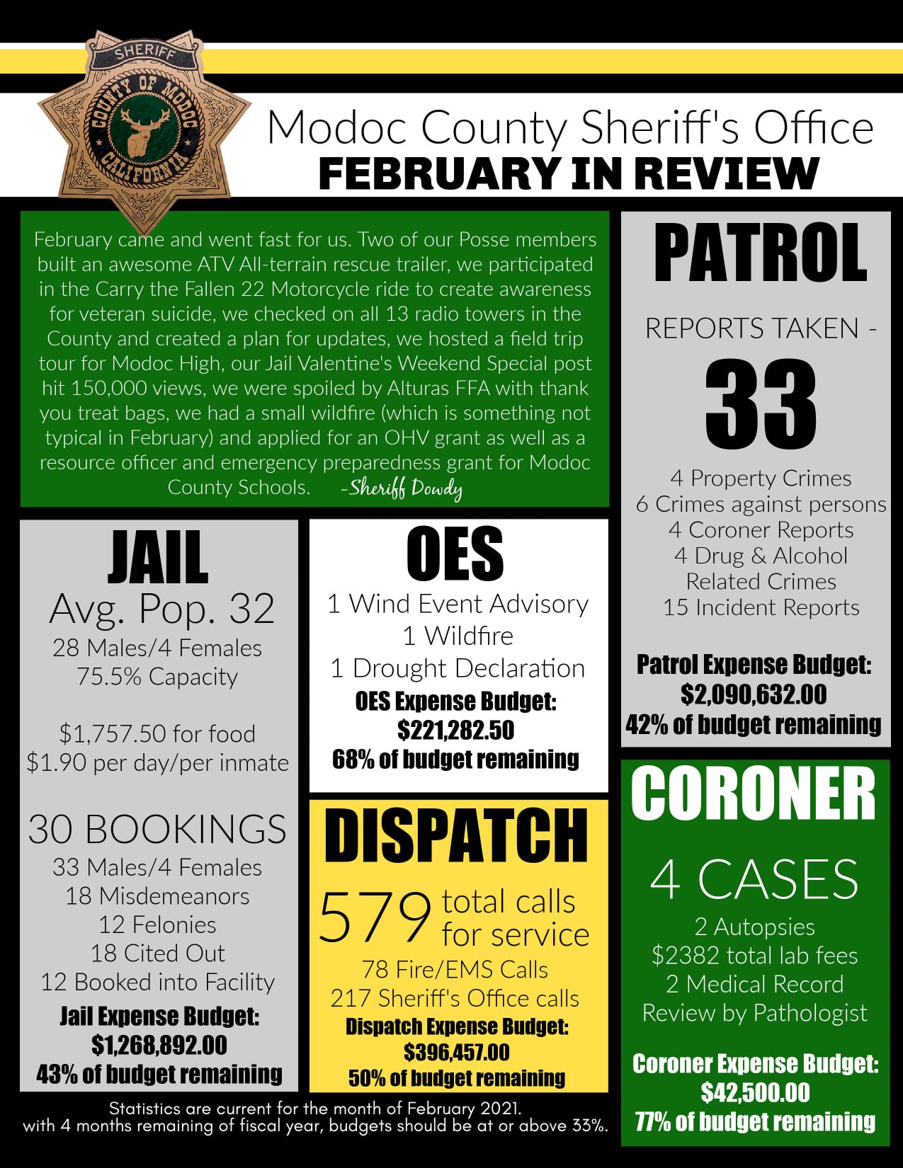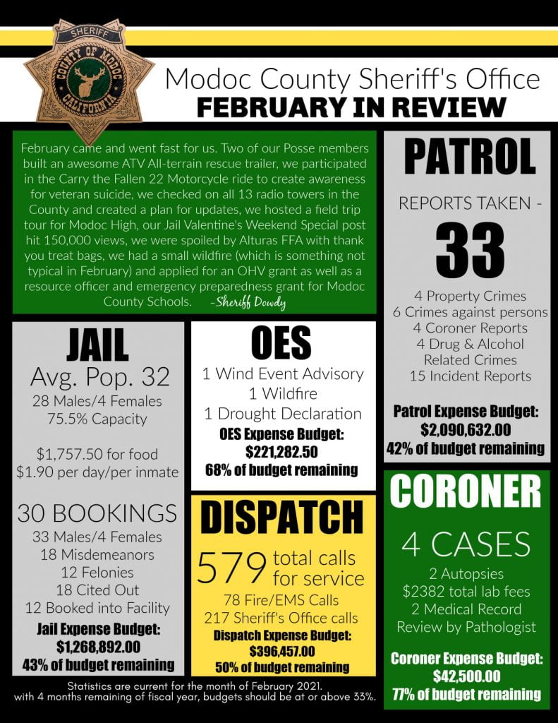 The Modoc County Sheriff’s Office has issued its February in Review bulletin, which presents local statistics such as total number of patrol reports, coroner cases, and calls to dispatch.