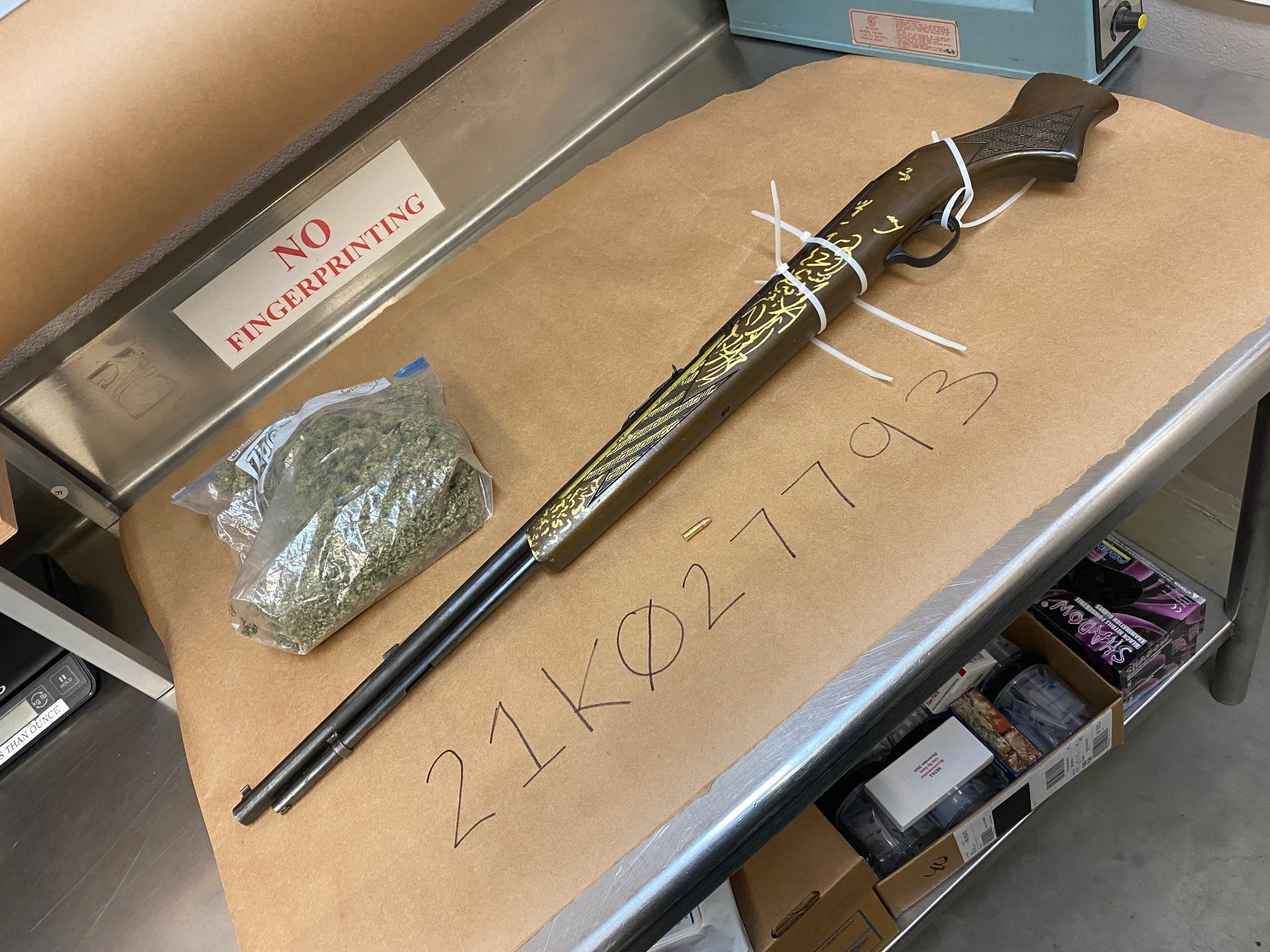 Deputies and backup officers from Hanford PD found Serna trying to hide in a nearby apartment, where they arrested him without further incident. Deputies then searched the Honda he’d been driving and reportedly found a modified rifle and over a quarter of a pound of marijuana.