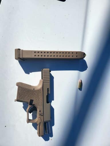 Los oficiales buscaron dentro del Jeep y encontraron una pistola cargada en el piso con un cargador extendido de 30 rondas adjunto. El arma no estaba serializada.