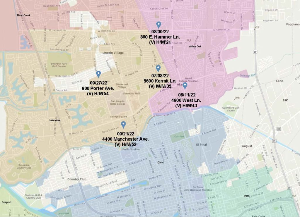 * August 30, 2022, shooting death of a 21-year-old Hispanic man in the 800 block E. Hammer Lane. The time of occurrence was 6:41 am.