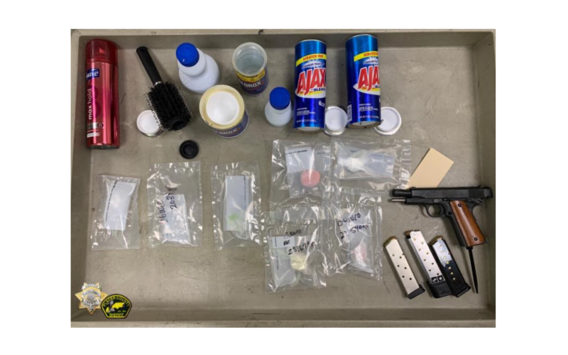 Other items seized included a hairspray bottle and three empty Clorox bottles, digital scales, ammunition, plastic baggies, and two firearms — one unregistered and one registered to a separate individual, the Sheriff’s Office said.