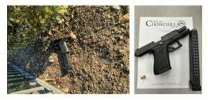 After further investigation and walking the path the fleeing parolees took, officers located a loaded, unregistered, fully automatic Glock 19 pistol with an extended 33 round magazine. An