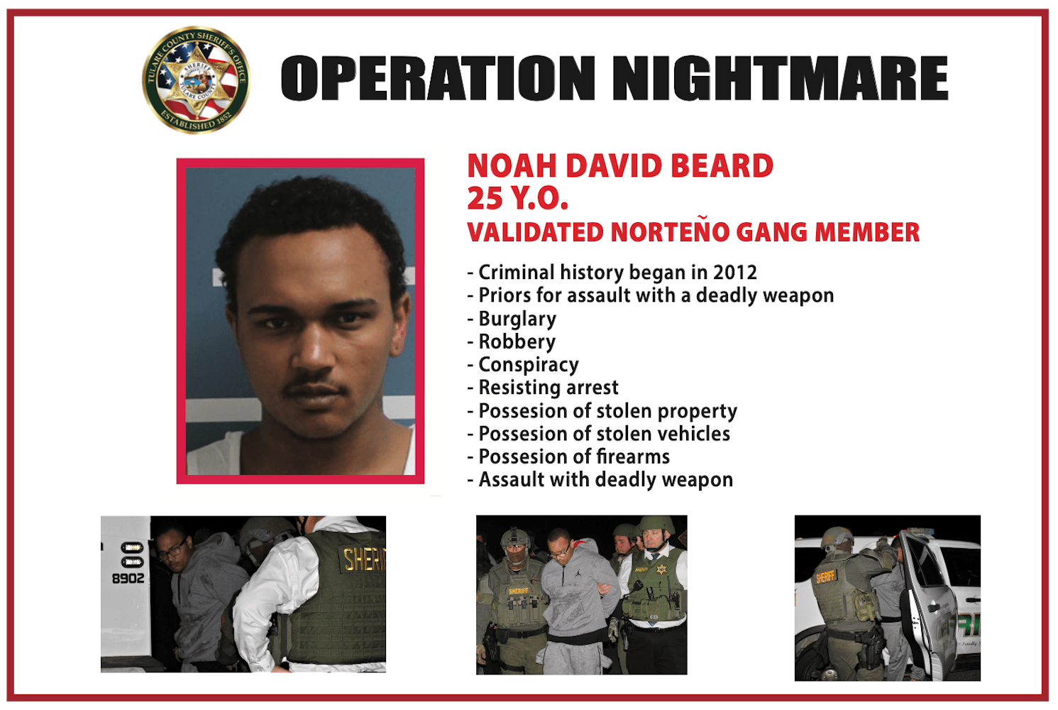 On the morning of Friday, February 3, over 100 federal, state, and local law enforcement personnel served search warrants at three locations in connection with the investigation. At the first location — on the 1000 block of South Noyes Street in Visalia — authorities located and arrested Beard without incident.