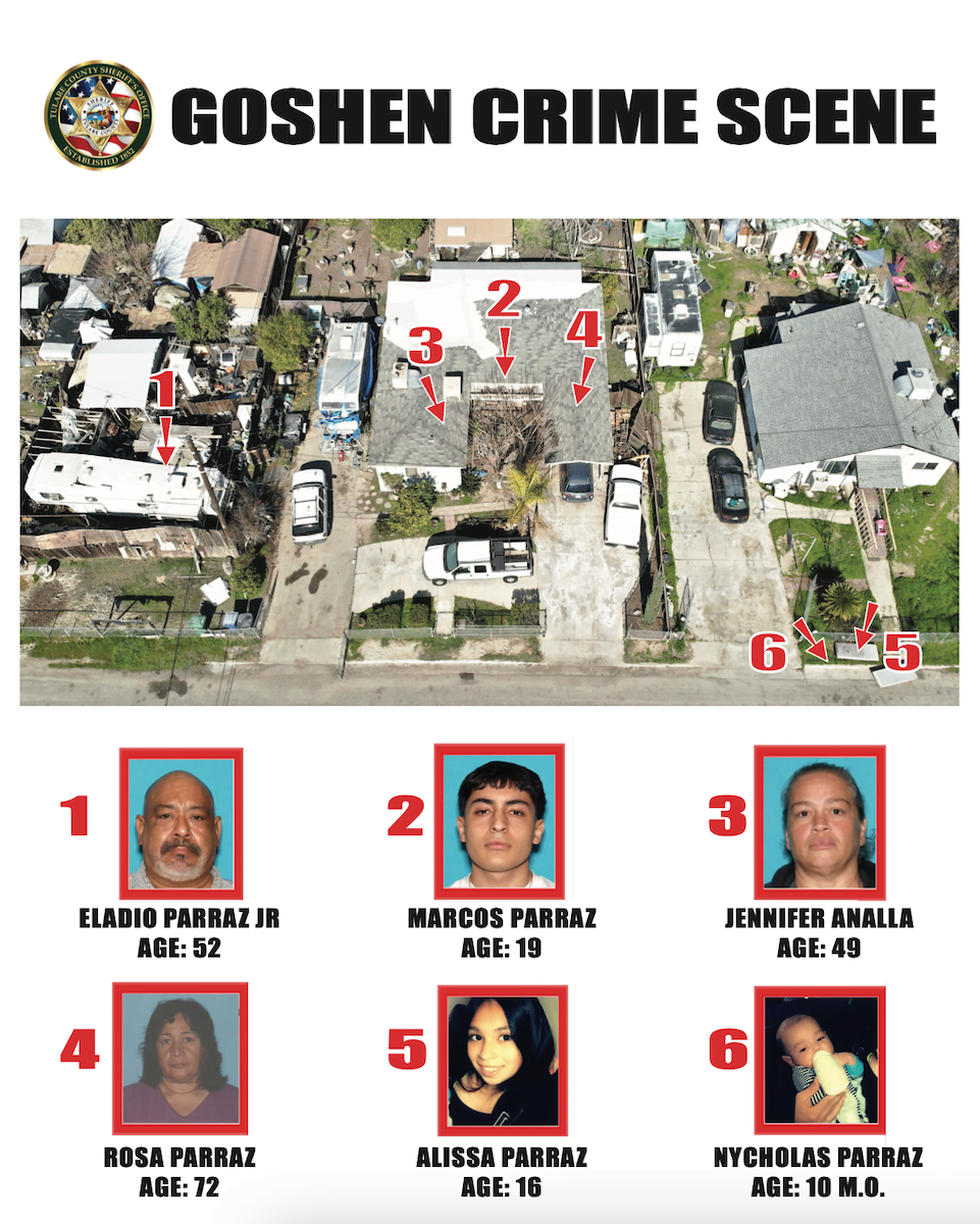 Although a motive has yet to be determined, the Sheriff’s Office reports that two members of the Parraz family were known and validated members of the Surreno gang. Uriarte and Beard are members of the Norteno gang, and Goshen is a predominately Norteno town, the Sheriff’s Office said.