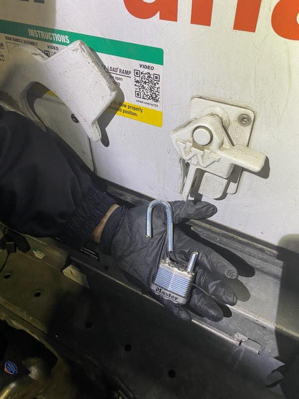 Officers also examined the U-Haul and discovered that the lock on the truck’s rear roll-up door had been cut (pictured left) and items from the truck, including those found in Choquette’s vehicle, had been taken from the inside.
