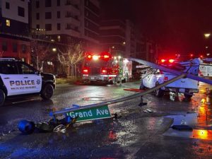 Officers “boxed in” the vehicle with patrol vehicles, but the suspect awakened, accelerated, and damaged two San Bruno Police Department vehicles, who were on scene to assist. In the process the suspect also crashed into a light pole near Grand Avenue and Miller Avenue. The suspect remained in the driver’s seat and initial attempts for him to voluntarily exit the vehicle were unsuccessful.