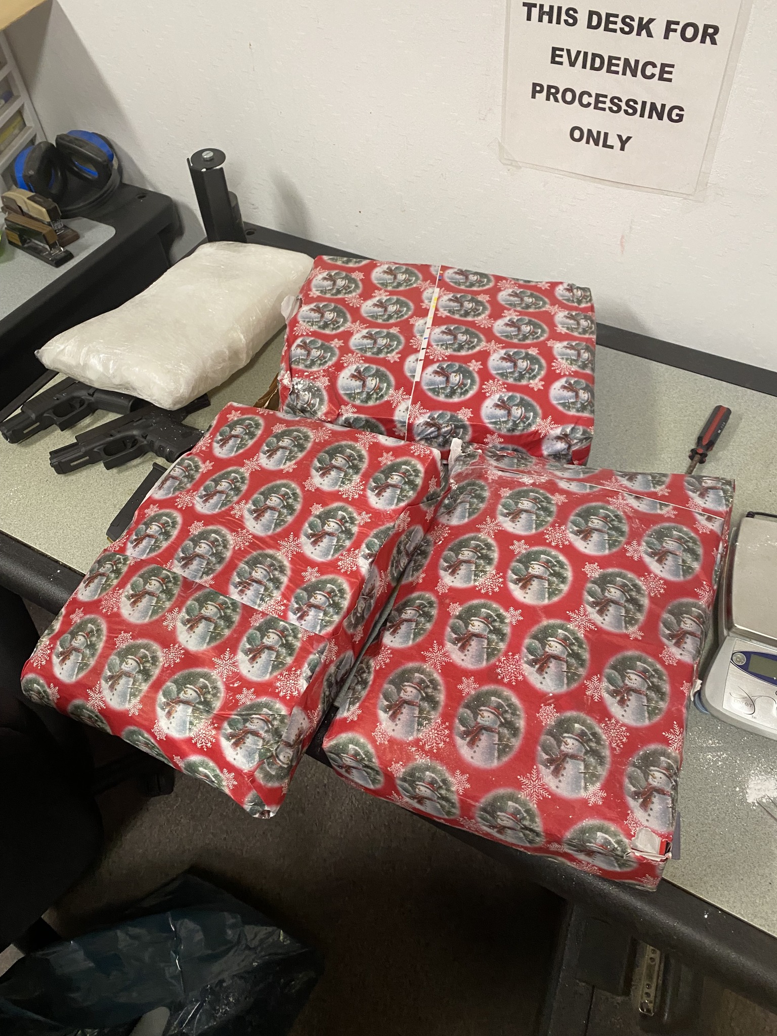 “On Wednesday, 12/20/2023, at approximately 0130 hours, a Weed Police Department officer conducted a traffic stop on a vehicle. During a search of the vehicle, approximately 20 pounds of narcotics wrapped as Christmas presents and two unregistered firearms were located.
