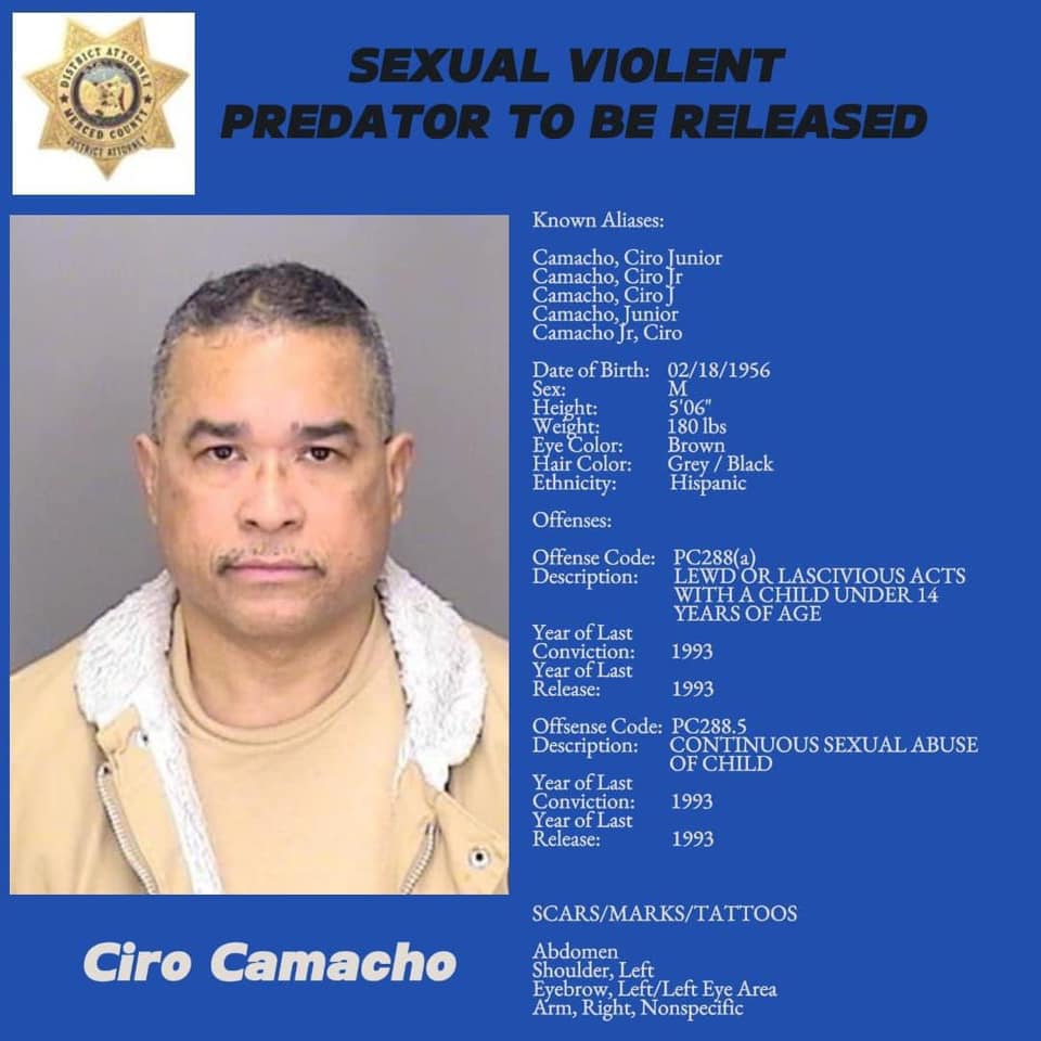 “The Madera County Sheriff’s Office has been made aware that on May 16, 2024, Judge Stephanie Jamieson of the Merced Superior Court ruled Ciro Camacho should no longer be classified as a Sexually Violent Predator and ordered him released from the California State Hospital, despite opposing evidence presented by the Merced County District Attorney’s Office.