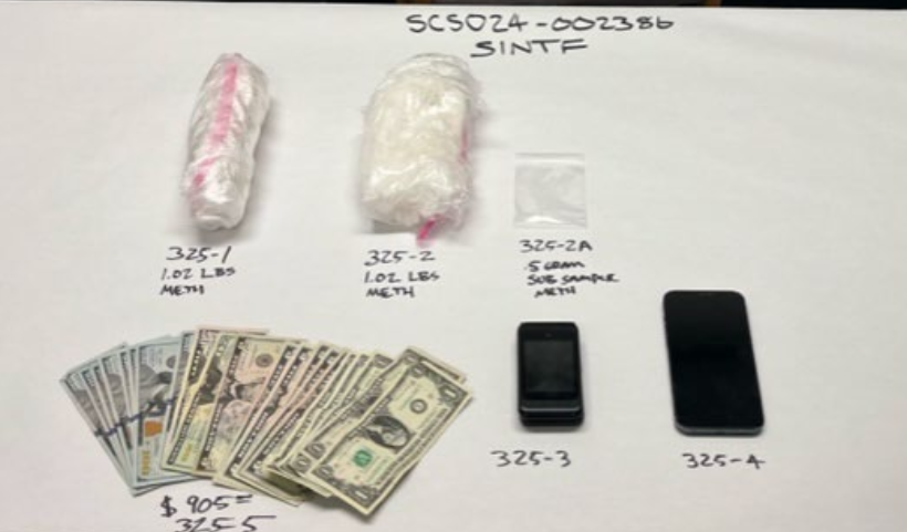 During the stop, deputies utilized K-9 Deputy Ace to search the vehicle. The K-9 reportedly alerted to the presence of narcotics, and deputies allegedly discovered just over two pounds of suspected methamphetamine in the vehicle.