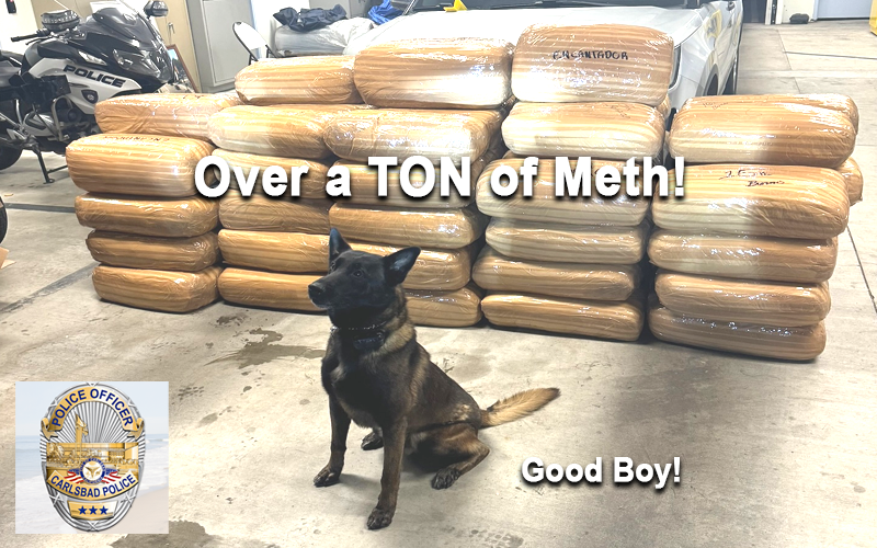During the traffic enforcement stop, and with the assistance of a Carlsbad Police K-9, officers discovered 2,563 pounds of packaged crystal methamphetamine. The seized crystal methamphetamine has an estimated street value of between $1.15 million to $3.08 million. The Carlsbad Police Department Crime Suppression Team frequently conducts traffic stops that have an impact not only on our city but also on San Diego County as a whole.
