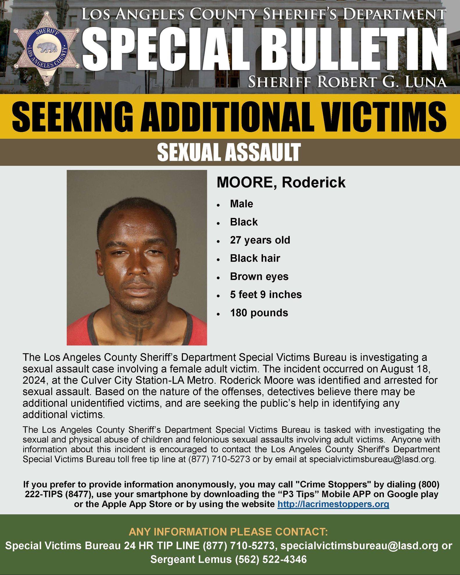 According to a press release, the Los Angeles County Sheriff’s Department has arrested Roderick Moore, 27, in connection with a sexual assault at the Culver City Metro station on Monday, Aug. 18.