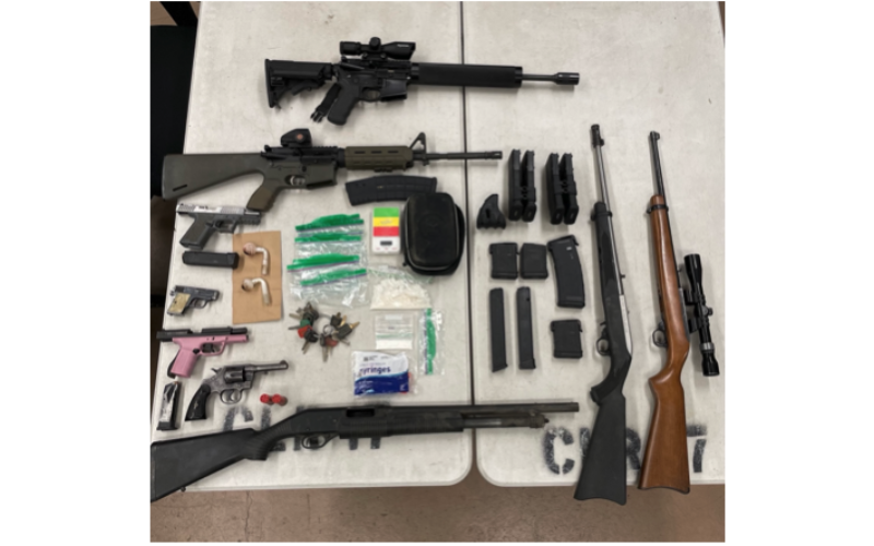 Investigators reportedly also confiscated several firearms and “a large quantity” of narcotics.