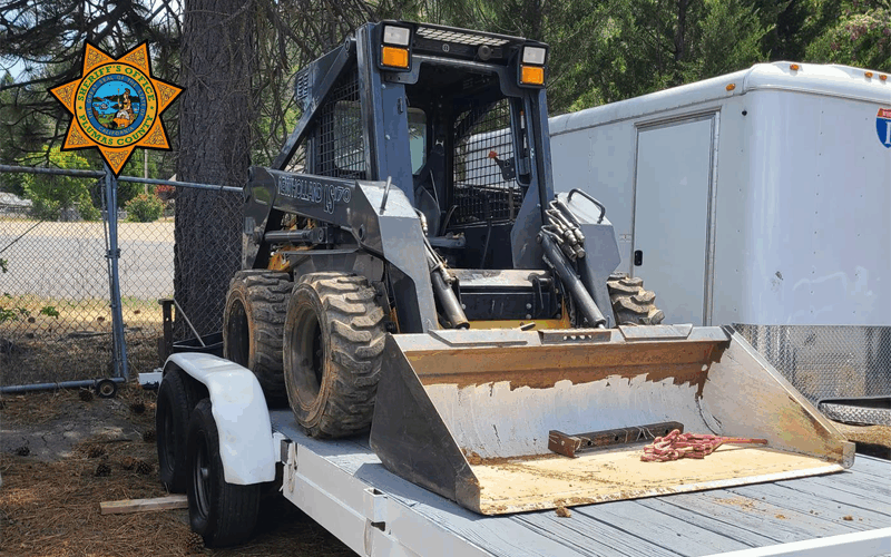 As a result of the check, deputies and detectives located methamphetamine and a loaded firearm inside the residence. Additionally, a skid steer and trailer, which had been stolen out of Washoe County, Nevada was recovered from the property.