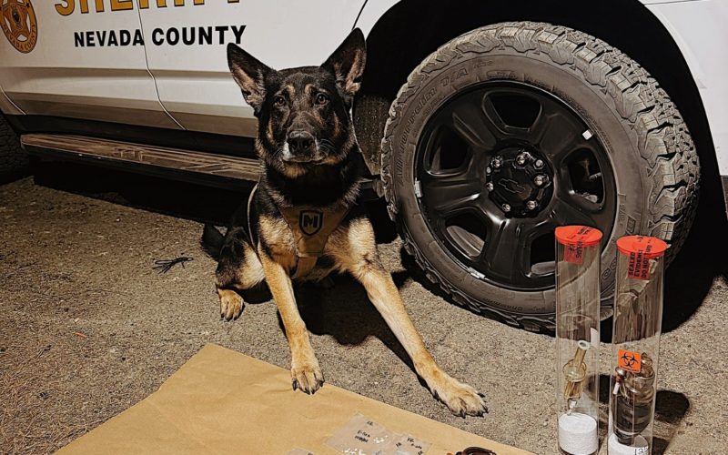 Nevada County Sheriff Deputy Ramos, with her K9 partner “Riggs”, was on patrol traveling down E. Main Street in Grass Valley when she observed a suspicious vehicle backed into a carwash, but not utilizing the facility. Recognizing the vehicle from prior criminal investigations of drug and property crimes in Nevada county, Deputy Ramos conducted visual surveillance of the vehicle at the business and contacted GVPD, since the activity was occurring within the city limits. GVPD officers and investigators arrived in the area and assisted Deputy Ramos with observation of the vehicle, a 2013 gray Ford Focus.