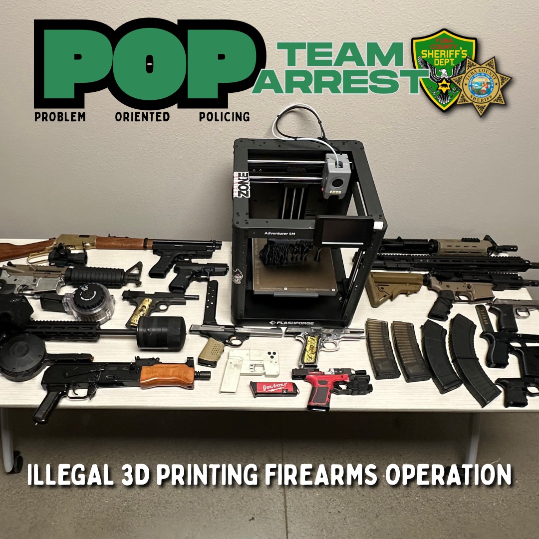 MARYSVILLE, CA — “Earlier this month, the Yuba County Sheriff’s Office Problem Oriented Policing (POP) Team initiated an investigation into suspected manufacturing of firearms using 3D printing technology and the illegal distribution of those firearms for sale.