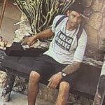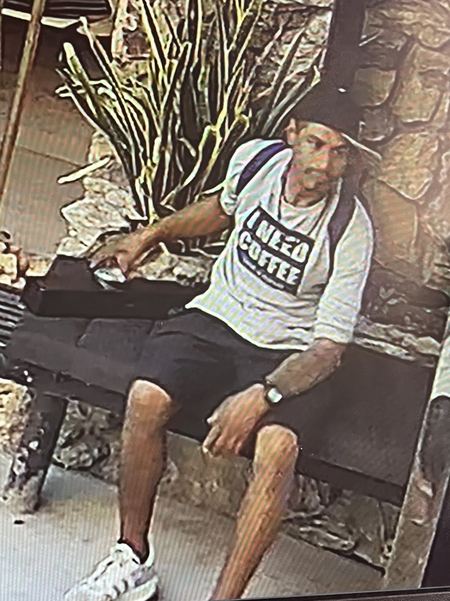 The man is described as Hispanic, in his 30s–40s, wearing a black cap, a white shirt with the phrase “I NEED COFFEE,” black shorts, and white shoes, and carrying a purple backpack. He has tattoos on his right leg, possibly an eagle design, and a right arm sleeve.