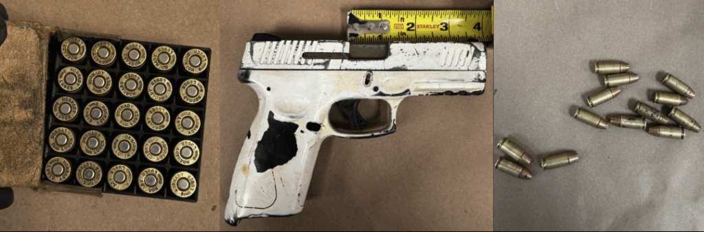 Deputies located the suspect, identified as Pedro Carrera-Hernandez, age 25 of Corning. During a search, Carrera-Hernandez disclosed he had a firearm. Deputies recovered a spray-painted handgun, a box of 9mm ammunition, loose rounds, and an empty magazine.