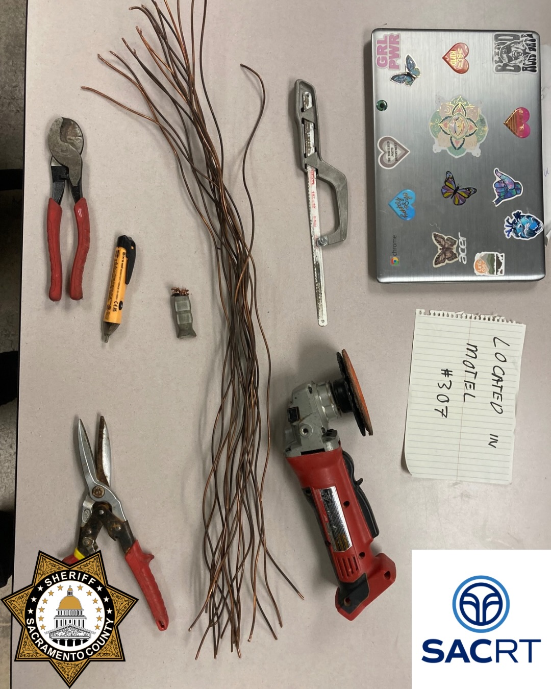 Deputies located Jones with wire cutters and stolen copper wire taken from poles supporting the overhead catenary system, with multiple poles having been damaged. Deputies also recovered approximately two pounds of stolen copper wire and additional burglary tools from his hotel room.